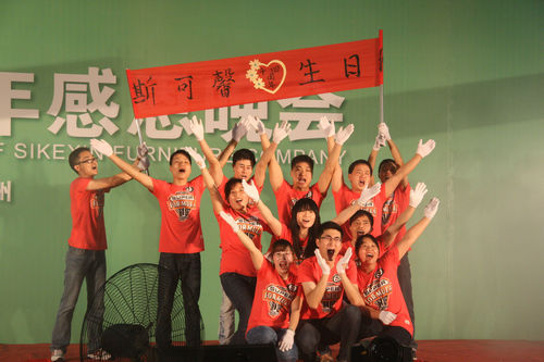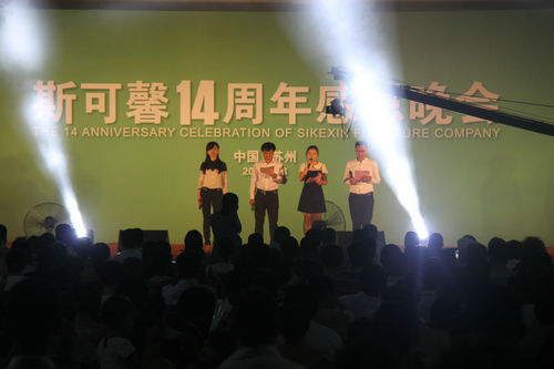 酒會(huì)結(jié)束就是本次斯可馨“感恩十四周年”感恩慶典活動(dòng)的重頭戲——“斯可馨14周年感恩晚會(huì)”。20時(shí),“斯可馨14周年感恩晚會(huì)”在一曲《快樂(lè)崇拜》舞蹈中正式開(kāi)始,斯可馨董事長(zhǎng)胡衛(wèi)東,副總裁戴桂飛,副總裁、華南、華西基地總經(jīng)理吳建林等公司高層上臺(tái)致辭,感謝經(jīng)銷商對(duì)斯可馨的支持與幫助,感謝斯可馨員工為斯可馨的付出和努力,公司高層集體向大家鞠躬,感動(dòng)全場(chǎng),響起雷鳴般的掌聲。接著,大型演出正式拉開(kāi)帷幕,斯可馨人自編自演的節(jié)目讓大家笑聲不斷,斯可馨智慧學(xué)堂也獻(xiàn)上團(tuán)隊(duì)展示為感恩之夜助興,經(jīng)銷商策劃的節(jié)目《小人物》更是堪稱經(jīng)典,融匯了斯可馨元素的同時(shí)讓現(xiàn)在觀眾捧腹大笑……。一曲曲動(dòng)聽(tīng)的歌曲、一段段精彩的舞蹈、一個(gè)個(gè)扣人心弦的表演,時(shí)而讓人捧腹,時(shí)而令人感動(dòng)。這一夜,是斯可馨的團(tuán)聚之夜,這一夜,是斯可馨的歡慶之夜,這一夜,注定無(wú)眠……