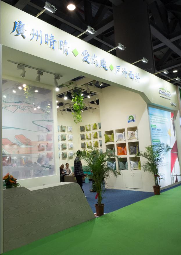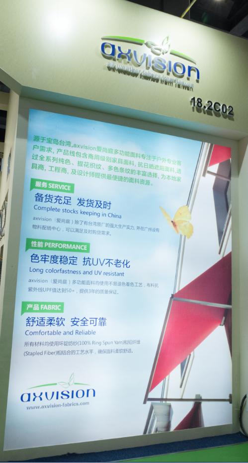 晴晴旗下的axvision(愛尚庭)室外多功能布搭配穩(wěn)定可靠的著色工藝以及細(xì)膩短長(zhǎng)纖混織, 使得材質(zhì)軟硬適中且高強(qiáng)度拉力。愛尚庭多功能布料在使用中,不僅壽命長(zhǎng)、色牢度穩(wěn)定、抗曬等級(jí)達(dá)到ISO105B02/B04標(biāo)準(zhǔn)的7-8級(jí)(最高為8級(jí)),而且布料全面經(jīng)抗紫外線處理, 日光保護(hù)指數(shù)可達(dá)UPF 50+,深受消費(fèi)者喜愛,整個(gè)生產(chǎn)過(guò)程安全環(huán)保,很快在戶外布料行業(yè)中脫穎而出。(如圖是2017CIFF 18.2C02展位展品圖)